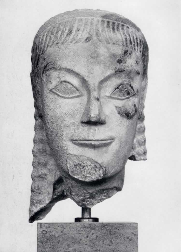 ○ 感動的なこの頭部像は 等身大より寸法が可成り大きい。直立した男の若者を描いた作品(図版 11 から 13 まで)が 初期ギリシャには幾つもあり、この彫像もそれらの作品グル-プの中の一つであるが、この頭部だけしか 今では現存していない。長いその頭髪が後頭部では ビ-ズ玉状の編み毛になって垂れ下がっている。幅広のリボンで留められた髪は、中央の分け目の左右に 均斉の採れた形で梳(くしけず)られ、そのリボンの下から 短くてぎざぎざになった縒(よ)り房状になって垂れ下がっている。顔の形が殆ど三角形に近いことと、表情をデザインするに当たって 幾つもの横の線に力点が置かれていること、つまり 口が殆ど一直線で、そこに一緒に鋭い彫り込みで 薄い両唇の線が印され、更には ア-モンド形の長い両眼を取り巻いて 両瞼が几帳面に刻み込まれていて、これが この頭部像の際立った特徴になっている。アッテイカ地方の初期の作品や イオニア地方の島々の作品と比較すると、この頭部像には 深みが乏しくて、輪郭にきつさが見られる。一段とより生硬に見えるし、辛辣な技法が使われていて 木彫りを思い起こさせる。この顕著な生硬さと或る種のマンネリズムとが、ボエオテイア地方の初期の作品の特色である。この地域では 他の地域で創り出された新機軸の受容性が高いことで スタイルの上での伝統主義が和らげられ、その結果 典型的な田舎の特色がより生き生きとしており、上品な要素と混じり合って 何か興味深い混合物が出来上がっているのが見られるのである。